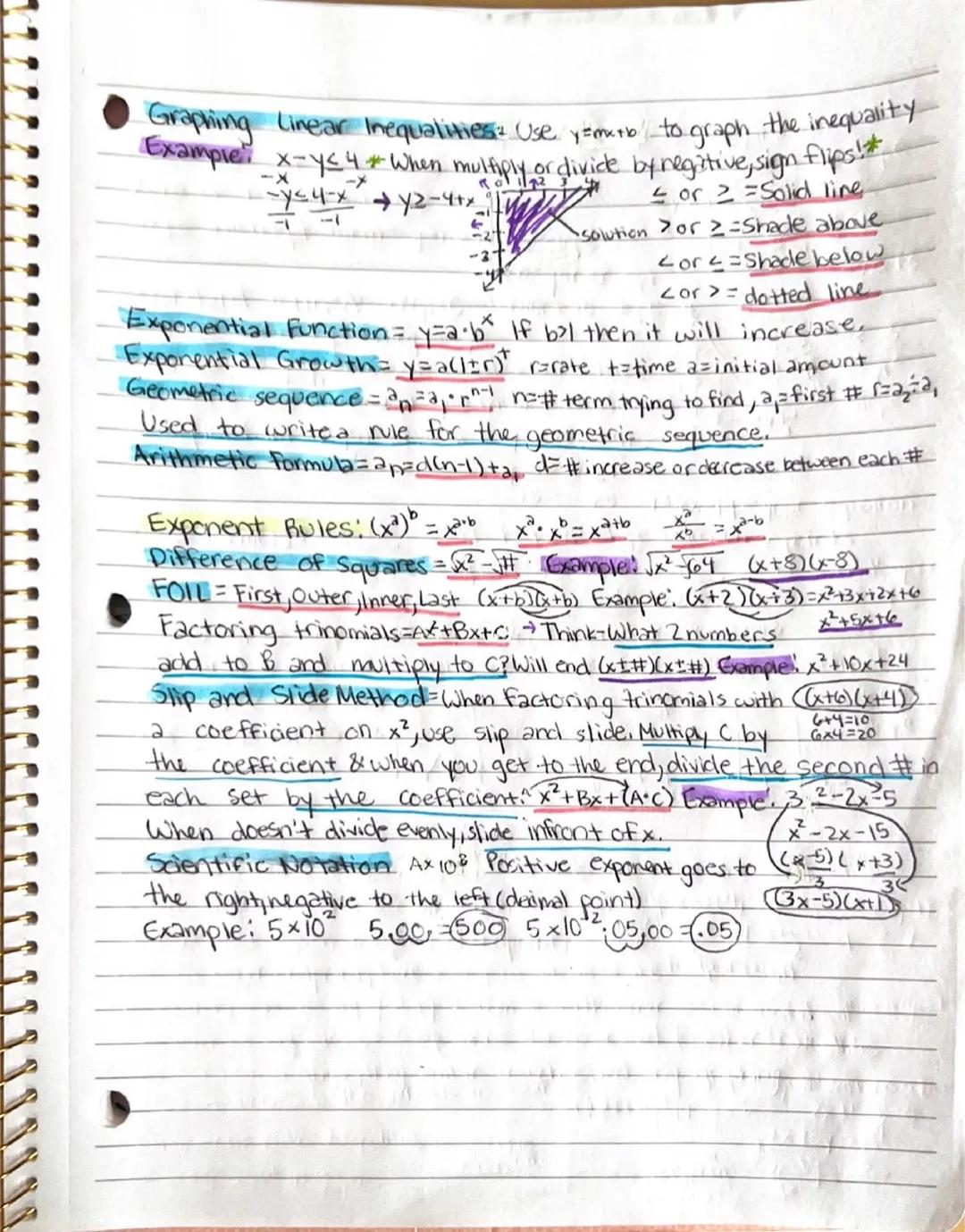 Factoring trinomials is explained, including the "slip and slide" method for trinomials with a coefficient on x².