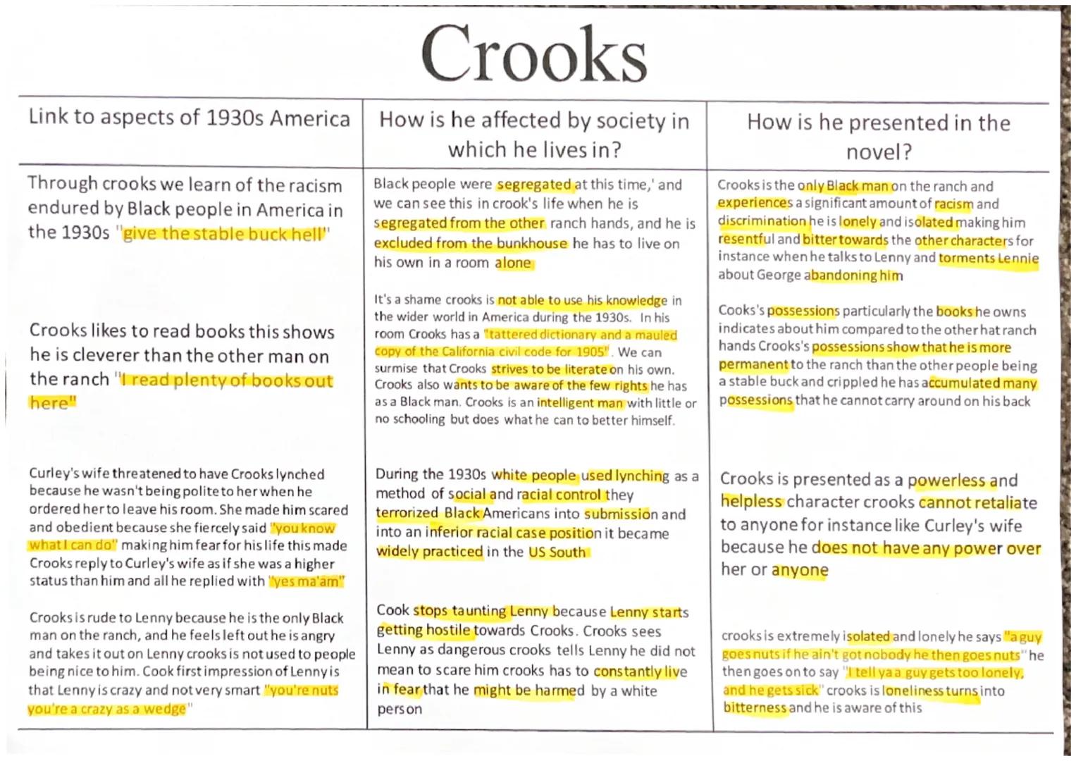 Highlight: Crooks' physical disability and race place him at the bottom of the ranch's social hierarchy, despite his intelligence and literacy.