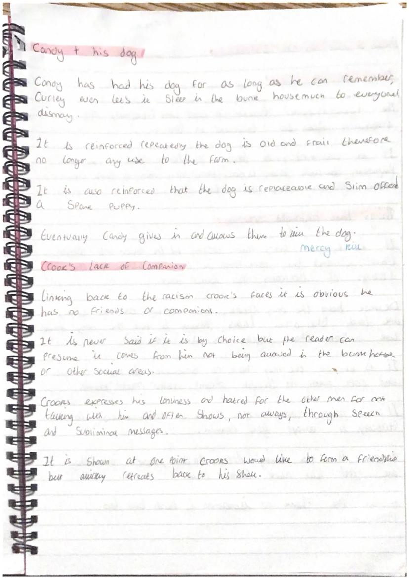 The second page focuses on Candy's relationship with his elderly dog and the broader theme of loneliness, particularly through Crooks' character. The narrative explores how companionship, or the lack thereof, affects different characters in the story.