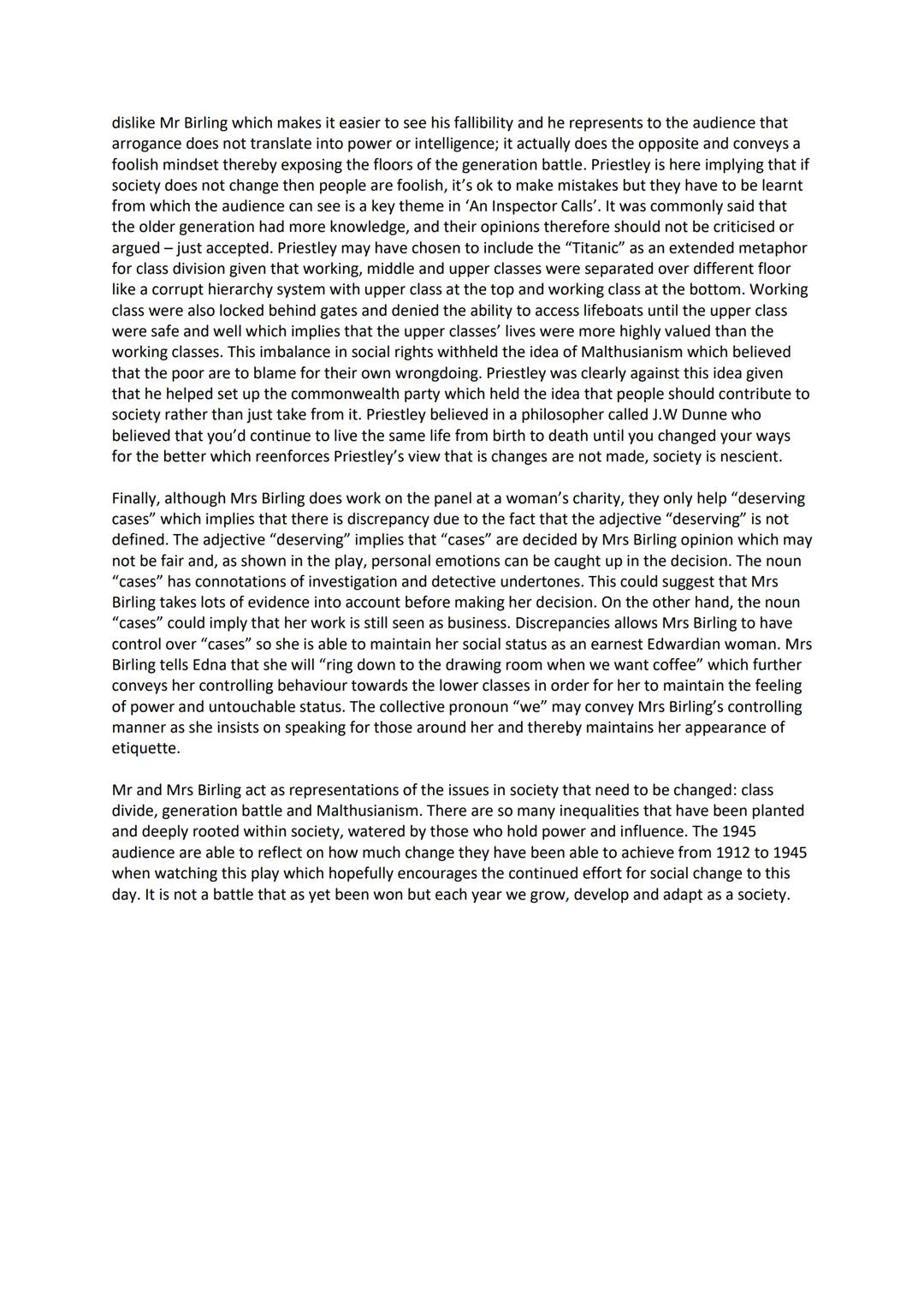 Priestley contrasts Mr Birling's views with those of his son, Eric, who argues that "these girls aren't cheap labour- they're people." This generational conflict highlights the changing attitudes towards social equality and workers' rights.