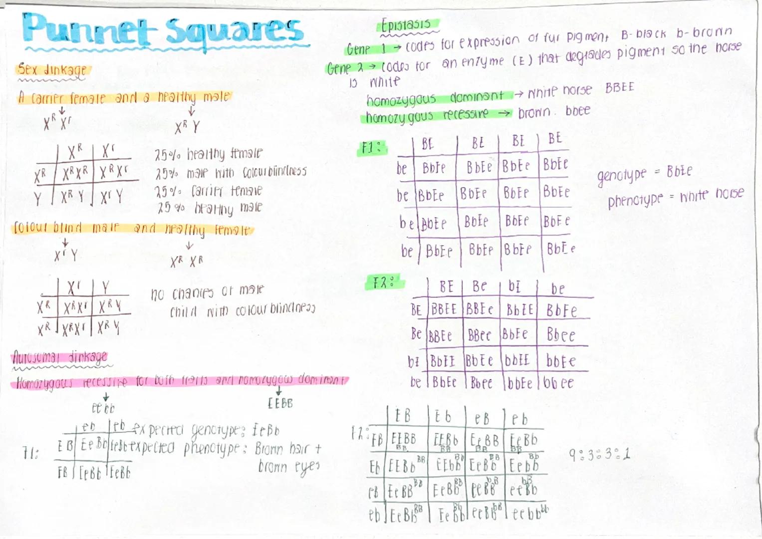 This page delves into more advanced genetic concepts, focusing on sex linkage and epistasis explained with punnet squares. It begins with an explanation of sex-linked inheritance, using color blindness as an example.