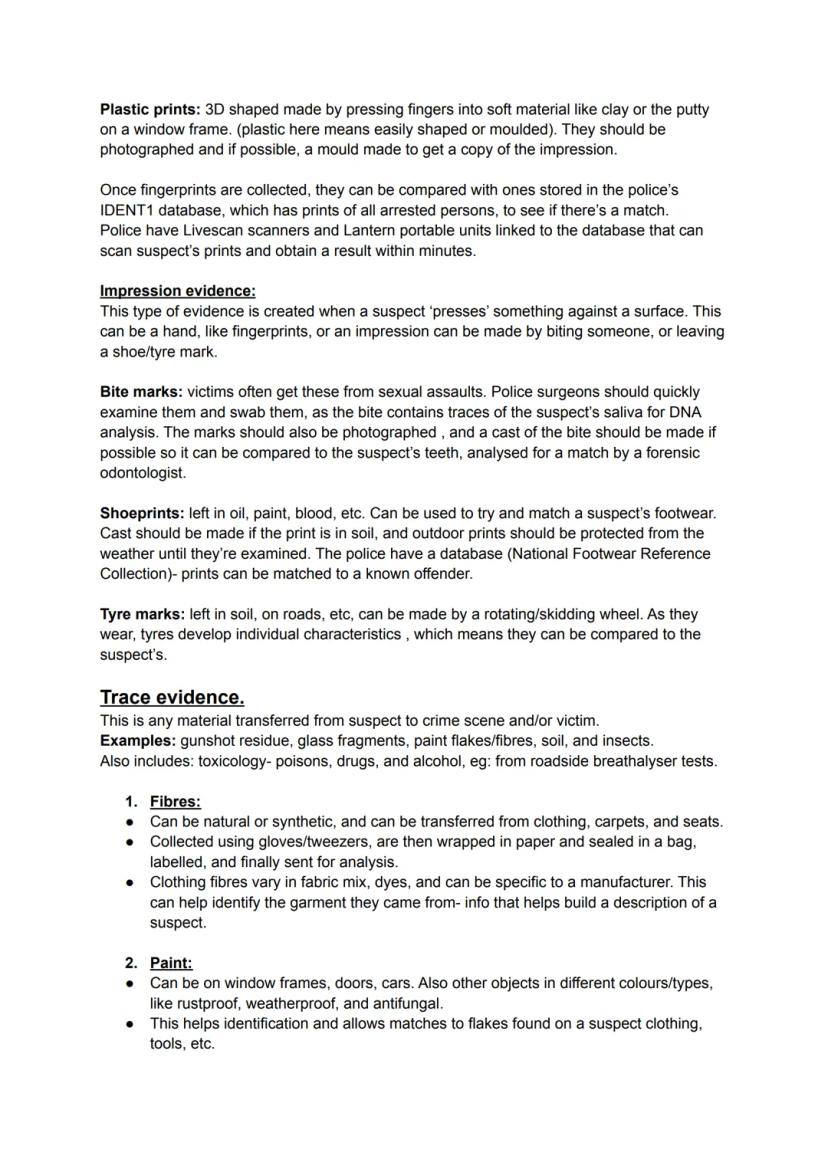 - Trace evidence (fibers, paint chips, soil samples) requires careful collection with sterile tools